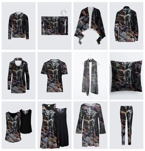 Fashion! Moi? Not exactly something I know much about (as anyone who knows me can attest), but when I saw their proposal I knew that they were right. My artwork looks terrific on clothing and other items. They just finished with the designs. There are twelve items to choose from — take a look!