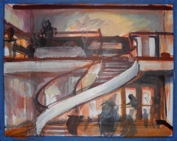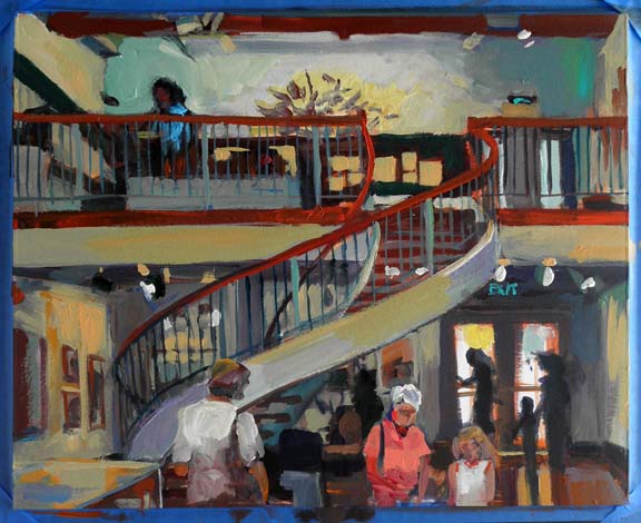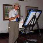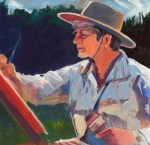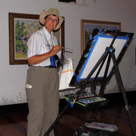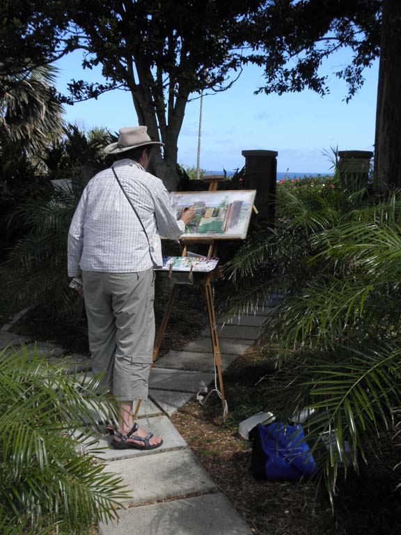 The weather this morning was rainy, so all the Super Saturday activities came inside the museum. This included my plein air painting — is it plein air if it’s indoors? Interested parents and kids could see the painting in progress and check out my painting gear. (Everyone admires the egg carton palettes.) In the afternoon the weather was gorgeous, and Diana came to work on her watercolor. I did a quick paint sketch of her while she was painting.