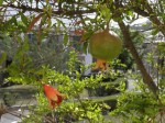 I learned recently that the tree right outside my door is a pomegranate tree. (Despite the drought here it seems happy, possibly thanks to the gray water from my dish washing and showers!)