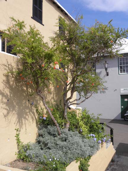 I learned recently that the tree right outside my door is a pomegranate tree. (Despite the drought here it seems happy, possibly thanks to the gray water from my dish washing and showers!)