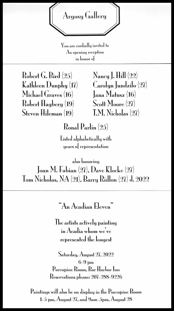 There was a lovely reception at the gallery in June, and there will be a major group show at the Bar Harbor Inn on August 27, 2022. I’m in excellent company with the “Acadian Eleven.”